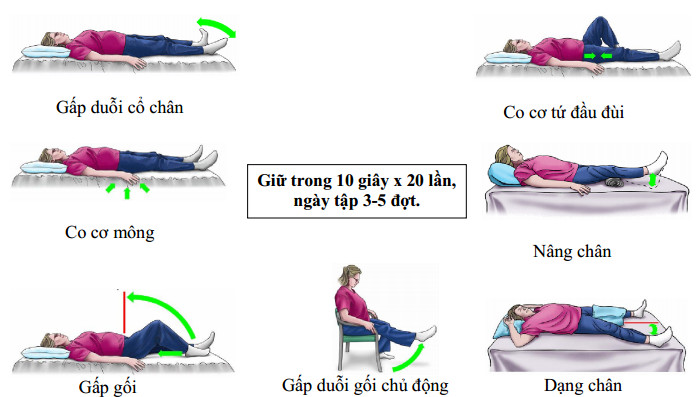 – Tập co cơ tĩnh: bệnh nhân nằm với gối thẳng, co cơ tĩnh cả 2 chân, mỗi lần co 5 giây rồi nghỉ 5 giây nâng. Nằm nâng chân lên khỏi mặt giường giữ trong 5-10 giây.