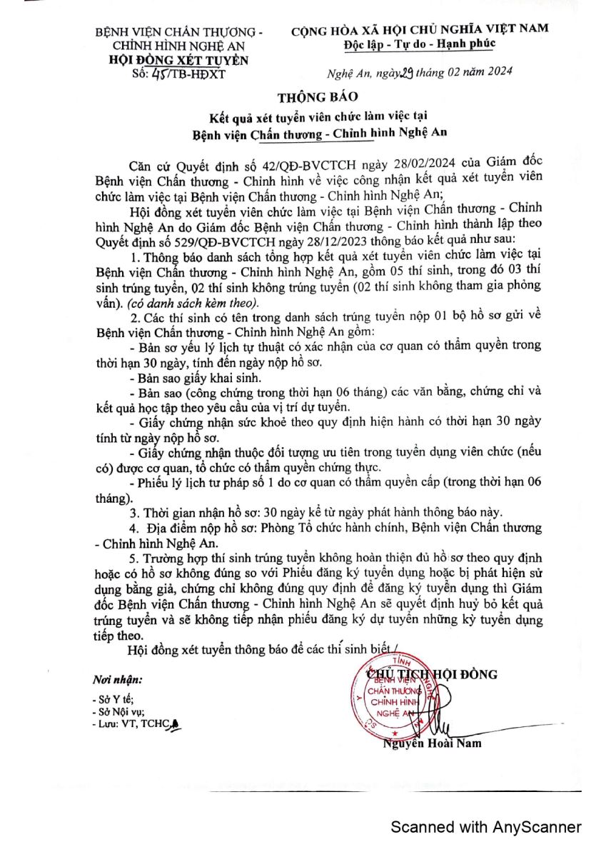 Thông báo kết quả xét tuyển viên chức làm việc tại Bệnh viện Chấn thương Chỉnh hình Nghệ An năm 2023