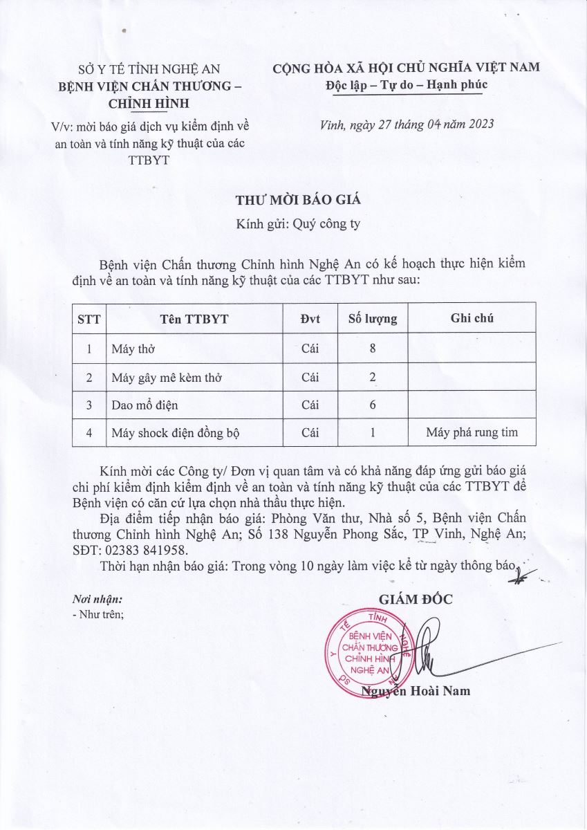 Bệnh viện Chấn thương - Chỉnh hình Nghệ An thông báo mời báo giá dịch vụ kiểm định về an toàn và tính năng kỹ thuật của các trang thiết bị y tế như sau: