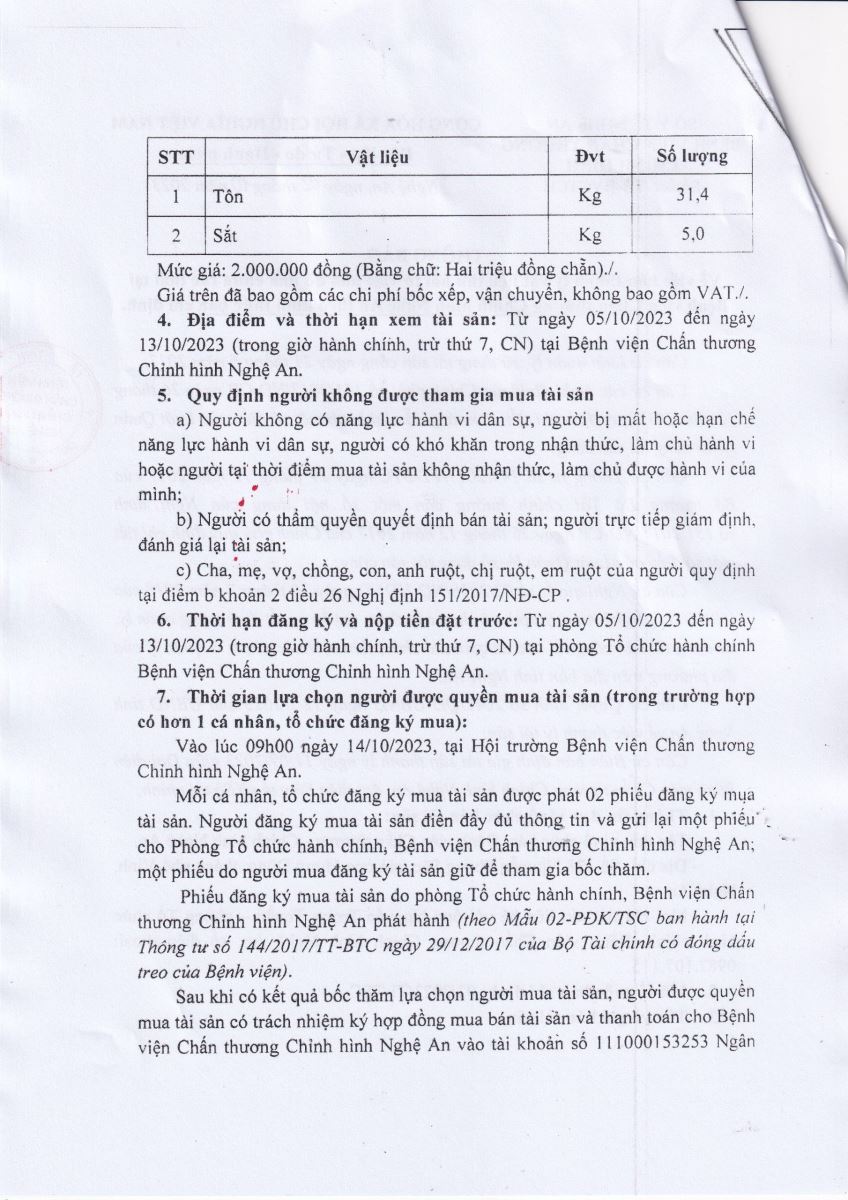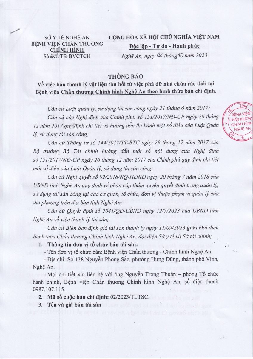 Thông báo về việc bán thanh lý vật liệu thu hồi từ việc phá dỡ nhà chứa rác thải Bệnh viện Chấn thương Chỉnh hình Nghệ An theo hình thức bán chỉ định