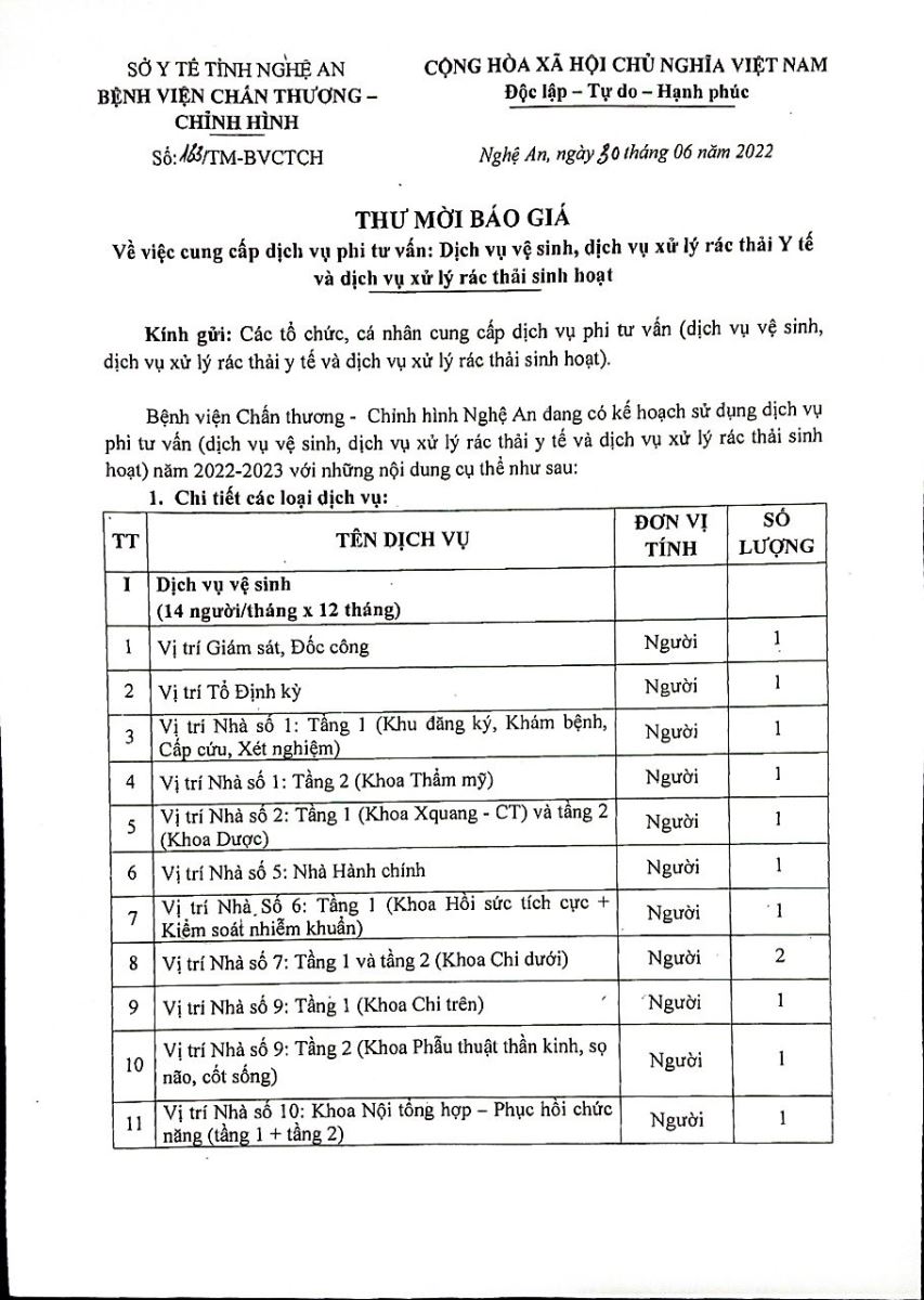Bệnh viện Chấn thương - Chỉnh hình Nghệ An thông báo mời chào giá: