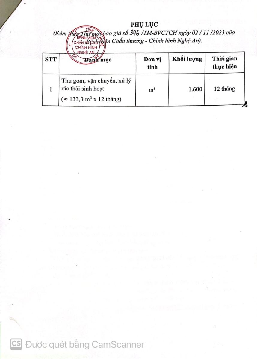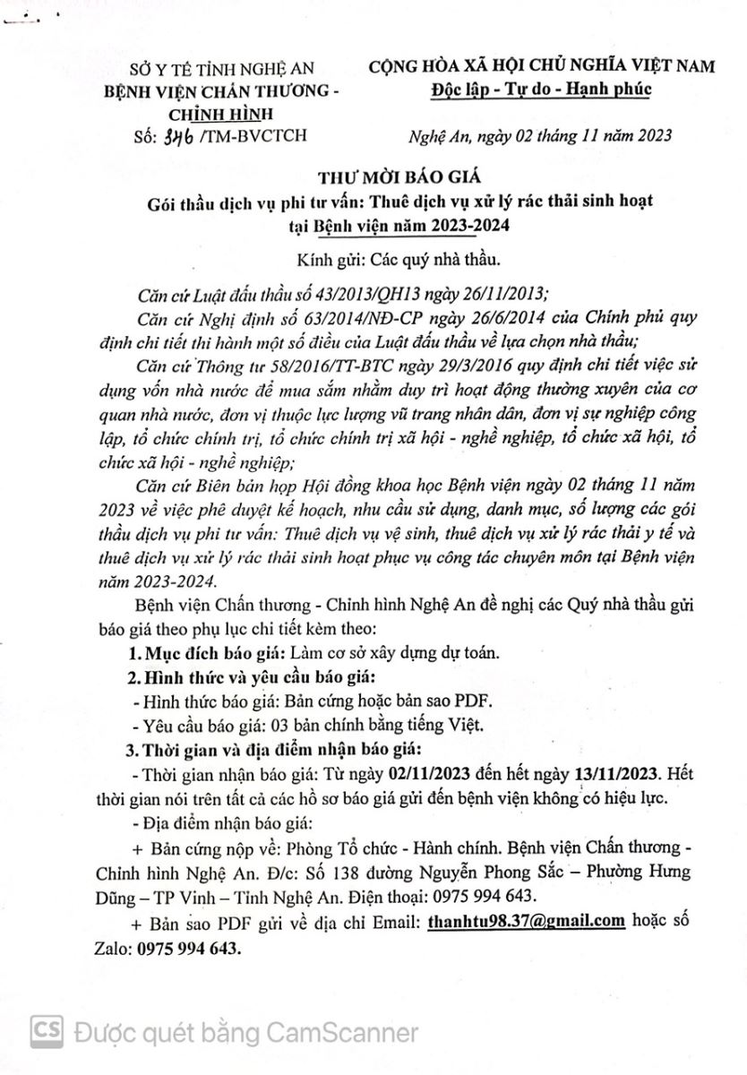 Bệnh viện Chấn thương - Chỉnh hình Nghệ An thông báo mời báo giá gói thầu dịch vụ xử lý rác thải sinh hoạt tại Bệnh viện năm 2023-2024 như sau: