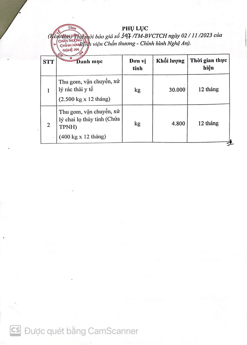 Bệnh viện Chấn thương - Chỉnh hình Nghệ An thông báo mời báo giá gói thầu dịch vụ xử lý rác thải y tế tại Bệnh viện năm 2023-2024 như sau: