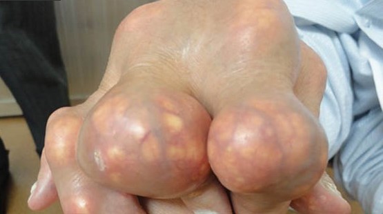 Nếu xung quanh khớp của bạn xuất hiện các cục u nhỏ thì bệnh của bạn đã bước vào giai đoạn nặng. Y học gọi đó là các cục tophi. Chúng được hình thành khi các tinh thể urat tích tụ quá nhiều và chúng liên kết lại với nhau thành từng cục.